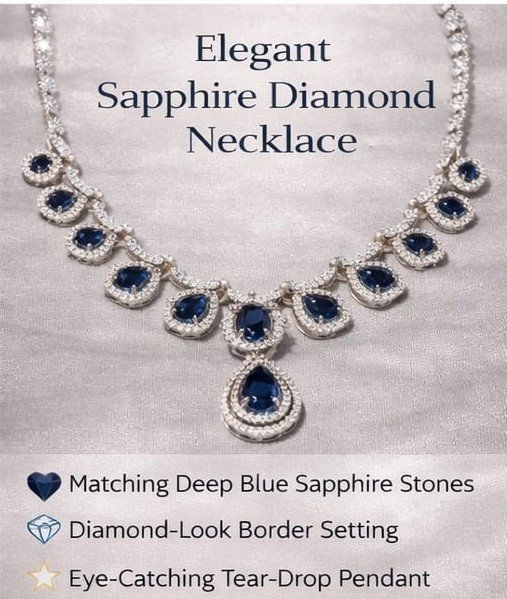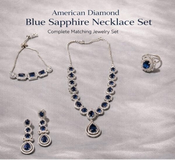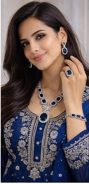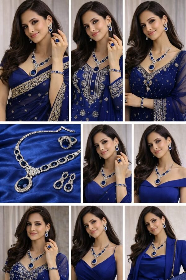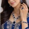 ही प्रीमियम AD ब्लू नेकलेस सेट तुमच्या लूकला राजेशाही आणि आकर्षक बनवते. उच्च दर्जाच्या अमेरिकन डायमंड्स आणि समृद्ध निळ्या रंगाच्या स्टोनमुळे हा सेट डायमंडसारखा चमकतो.