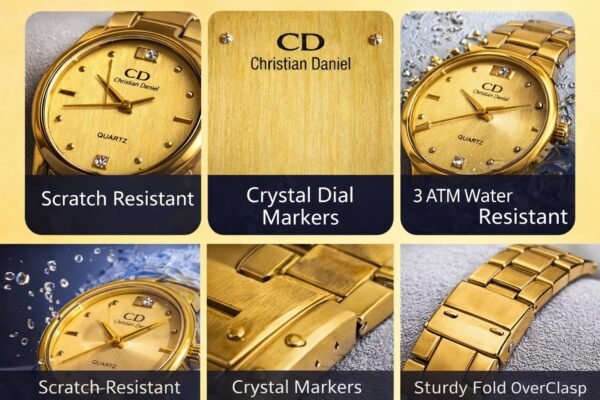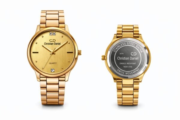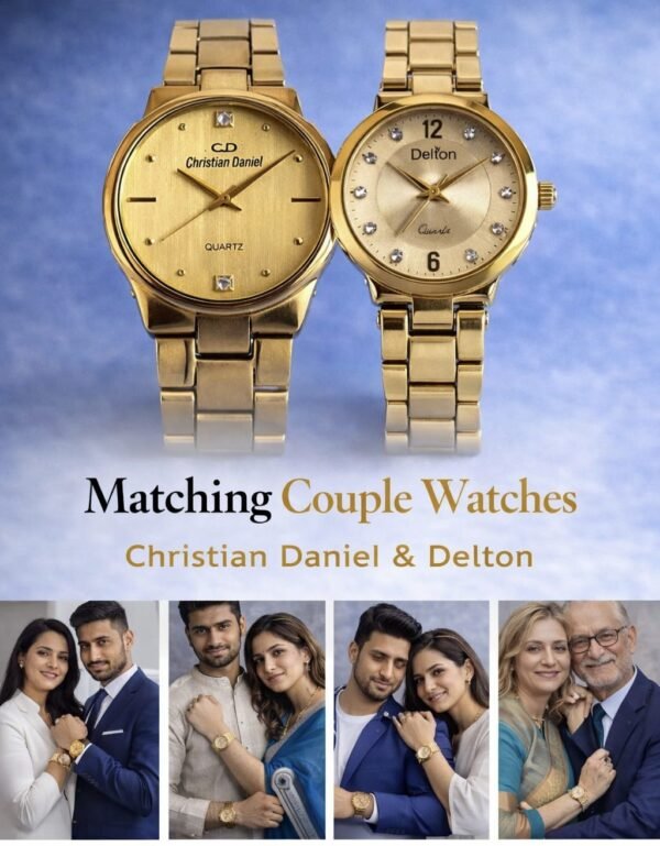 हे Matching Couple Watch Set प्रेम आणि नात्याचे सुंदर प्रतीक आहे. Christian Daniel (पुरुष) आणि Delton (महिला) घड्याळे आकर्षक सोनेरी फिनिश मध्ये डिझाइन केलेली आहेत. प्रत्येक खास क्षणासाठी परिपूर्ण.