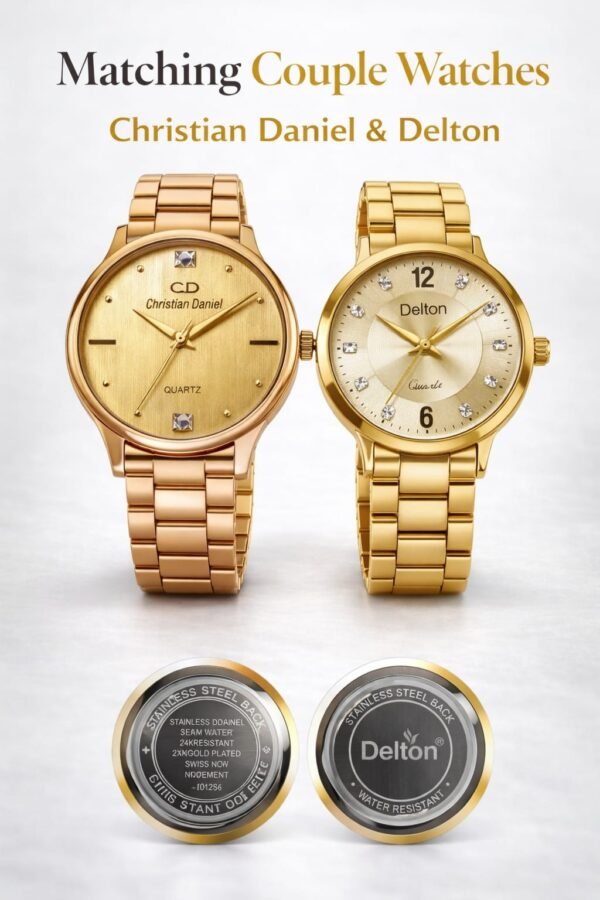 Celebrate togetherness with this elegant Matching Couple Watch Set featuring Christian Daniel (Men) and Delton (Women) watches. Designed in a luxurious gold-tone metal finish, these quartz watches symbolize love, style, and timeless bonding. Perfect for couples who love to match their style on every occasion.