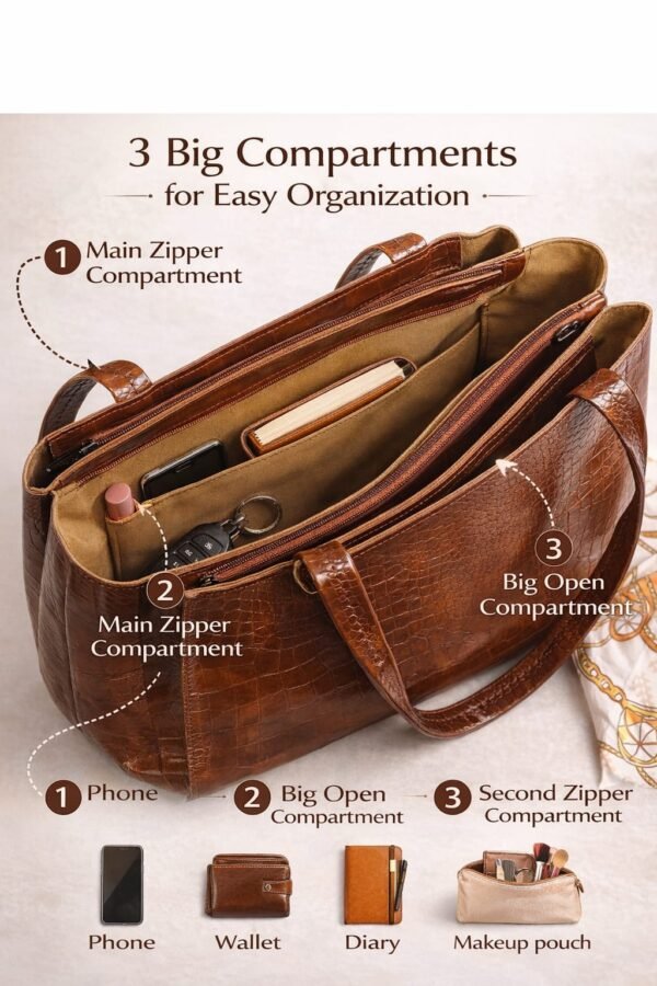 પ્રીમિયમ શુદ્ધ લેધર મહિલાઓની ટોટ બેગ – રિચ બ્રાઉન ફિનિશ